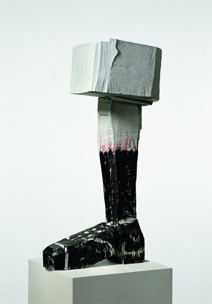 Grundsätzlich stellt Baselitz alles in Frage. Mit seiner großen Plastik „Römischer Gruß“ von 2004 tritt er die Geste des von den Nationalsozialisten genutzten Grußes mit ausgestrecktem Arm, im wahrsten Sinne des Wortes, mit Füßen.