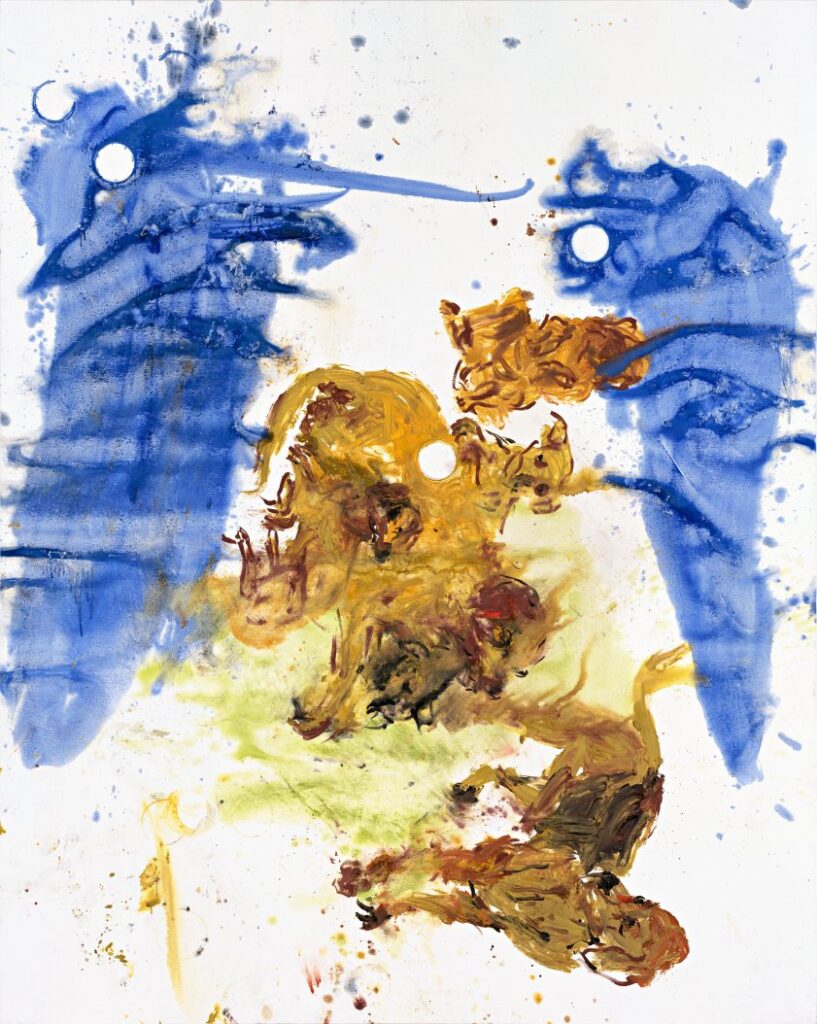 In seinem Gemälde „A Domestic Scene I“ stehen und sitzen in der Bildmitte goldene Hunde, links und rechts flankiert von blauen flatternden Flügeln. Die skizzenhafte, flüchtige Szenerie ist seine Interpretation von Rafaels „Sixtinischer Madonna“. Ein Gemälde, das Baselitz so sehr hasste, dass er es für sich neu umdeutete, erklärt die Museumsführerin.