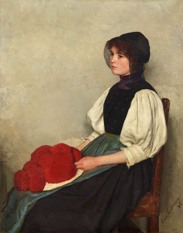 Die Malerin spezialisierte sich auf Figurenbilder mit volkstümlichen Interieurs und Trachten. Das Gemälde „Schwarzwälderin“ weist auf Erdmanns Verbindung zu dem Karlsruher Akademieabsolventen Wilhelm Hasemann hin, der in Gutach im Schwarzwald eine Malerkolonie gegründet hatte, die sich auf die dortige Folklore konzentrierte. Das Gemälde wurde von der Nationalgalerie gleich nach seiner ersten Teilnahme an einer Berliner Akademieausstellung 1901 angekauft.