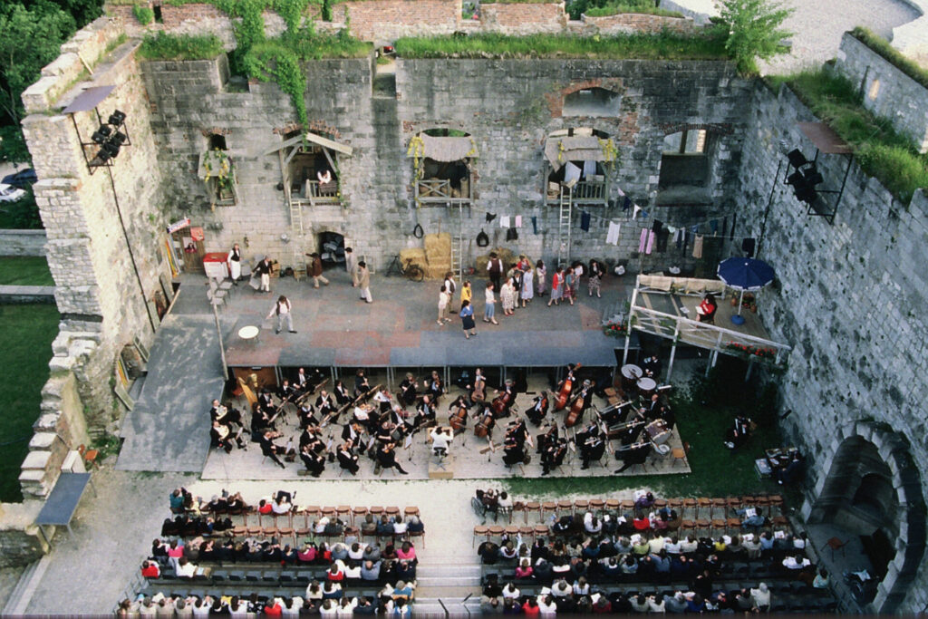 Nach einem gemütlichen Abendessen auf der sonnigen Terrasse der Schlosswirtschaft ließen wir uns in der Vogtei und Marstall des Schlosses Hellenstein in die Oper einführen. Danach begaben wir uns in die mittelalterliche Ruine des Rittersaales des Schlosses. Es war ein ausgesprochen sonniger Tag, und als es dunkel wurde, schien der Mond und zauberte ganz besondere Lichtverhältnisse auf die Bühne. Die musikalische Leitung hatte Markus Bosch, wie auch bei den vorherigen Opern, die wir besucht hatten. Für die Inszenierung war Georg Schmiedleitner zuständig. Es spielten die Stuttgarter Philharmoniker, der Festspielchor war wie in den vorherigen Jahren der Tschechische Philharmonische Chor Brünn.
