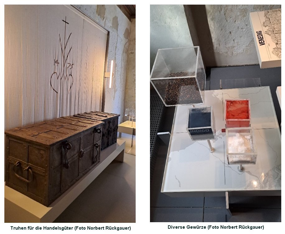 In einem weiteren Raum waren die Handelsgüter ausgestellt, mit denen die „Große Ravensburger Handelsgesellschaft“ gehandelt hat. Oberschwäbische Leinwand aus Flachsgarn und Barchent, ein Mischgewebe aus Leinwand und Baumwolle, wurde verkauft. Seit Mitte des 15. Jahrhunderts handelte die Gesellschaft mit hochwertigen Gebrauchs- und Luxusgütern aus dem Orient und ganz Europa, die gerade Konjunktur hatten, unter anderem auch Gewürze, wie z.B. Safran, und Spezereien. Sitz der Gesellschaft war Ravensburg und die Verwaltungszentrale befand sich hier. Geführt wurde die Gesellschaft von der Familie Humpis.