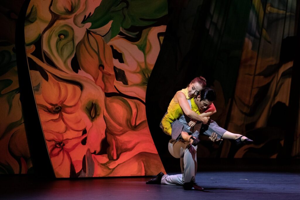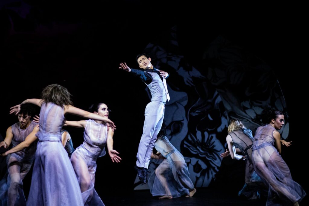 Der erste Akt lebt von Helligkeit, sowohl in der Kulisse mit vielen Blumen, als auch von den farbenfrohen Kostümen der Tänzerinnen und Tänzer.