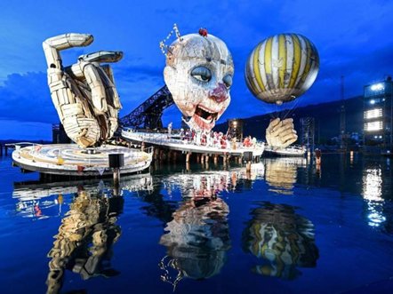 Die Bühne wurde beherrscht von Rigoletto. Zu sehen war sein 35 Tonnen schwerer und 13 m hoher beweglicher Clownskopf. Der Kopf bewegte sich, er senkte sich, seine Augen, die auf am Anfang geschlossen waren, öffneten sich und folgten dem Bühnengeschehen, er lachte, er ängstigte sich, er zeigte Entsetzen. Zum Schluss, als Rigoletto seine geliebte Tochter Gilda verlor, fielen ihm sogar die Zähne aus. Auf und in diesem Kopf wurde gesungen und geklettert, man wähnte sich zuweilen in einer Akrobatiknummer im Zirkus. Rigoletto hatte auch zwei Hände. Die rechte Hand hielt einen gefüllten Ballon mit 13 m Durchmesser, der zweimal während der Aufführung stieg, einmal mit Gilda im Ballon, und zwar auf 15 m. Am Schluss der Vorstellung, als Gilda stirbt, sogar auf 45 m.