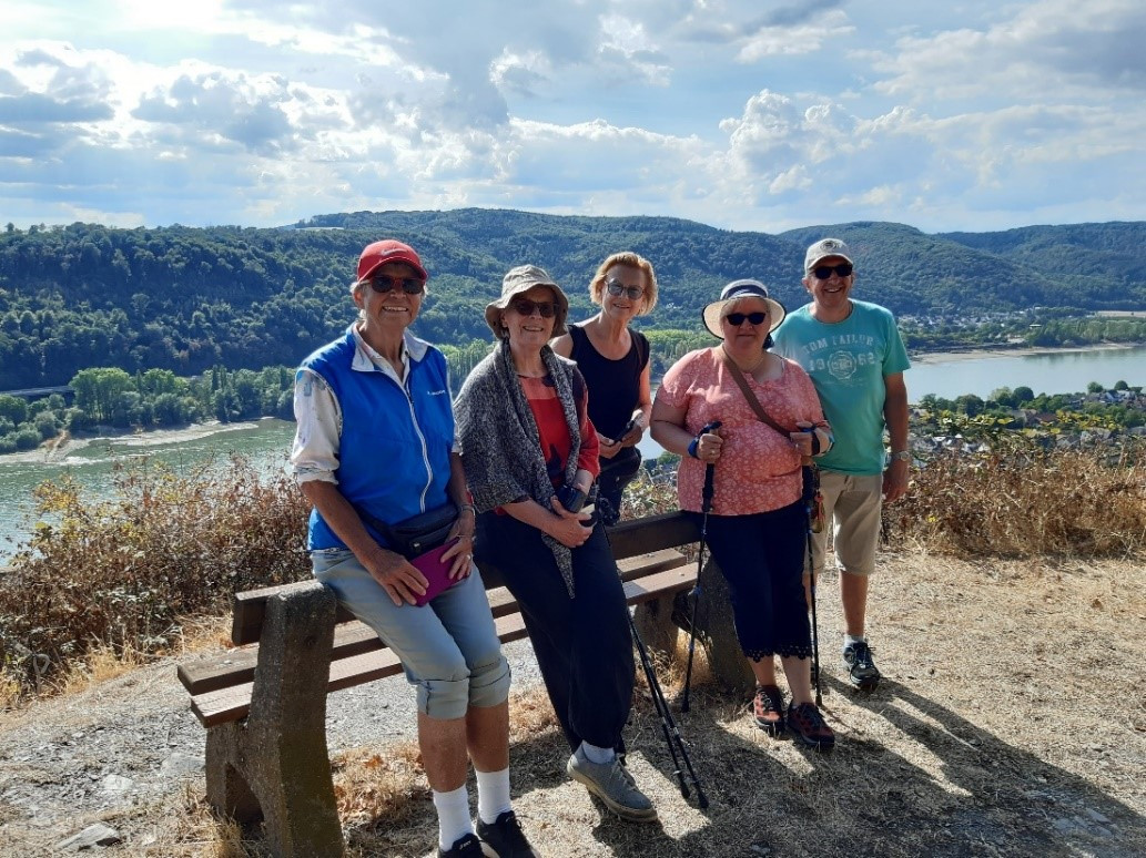 Unser Weg führt uns nach einem kurzen kräftigen Anstieg auf gleicher Höhe bis zum Abstieg nach Leutesdorf. Als es an den Abstieg geht, befragen wir einheimische Wanderer nach dem bestmöglichen Weg und erhalten zwei Alternativen, einen schönen breiten Weg mit schöner Aussicht auf Andernach, den Rhein und Leutesdorf, allerdings sonnig und heiß, oder ein schattiger, steiler, zuweilen schwieriger Pfad durch Wald ohne Aussicht.  Wir teilen uns in zwei Gruppen auf und treffen oberhalb Leutesdorf wieder zusammen. Auf unseren Wegen können wir immer wieder die Felsformationen mit dem rheinischen Schiefer bewundern.