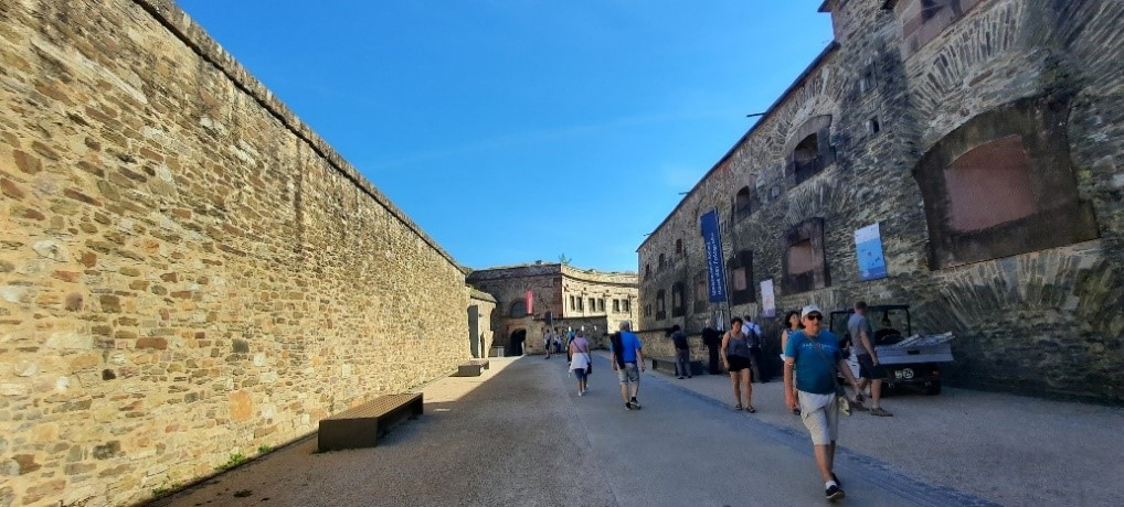Nun geht es durch den Eingang in die Festung. Wir durchqueren die ersten Festungsmauern und gehen in einen Trakt der Festung, der zum einen eine „Wohnkasematte“ und zum anderen eine „Geschützkasematte“ zeigt.