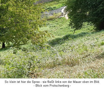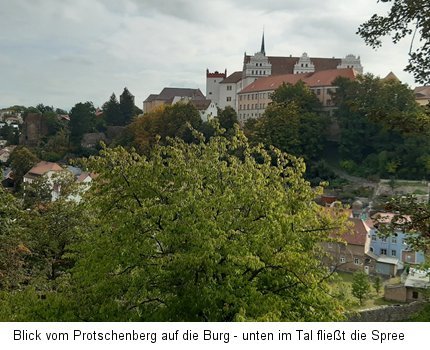 Vom Burgberg fuhren wir über die Friedensbrücke, von der wir einen herrlichen Blick auf die Altstadt hatten, auf den Protschenberg, der auf der anderen Seite der Spree gegenüber dem Burgberg liegt. Von hier aus war der Blick auf die Altstadt von Bautzen sehr beeindruckend – der schönste Blick auf Bautzen, wie unser Reiseführer sagte. Unter uns der kleine Bach, die Spree, dahinter der Burgberg und die Altstadt von Bautzen mit ihren Türmen. Die Spree, der kleine Bach, kann aber bei Hochwasser den tiefer gelegenen Teil von Bautzen total überschwemmen.