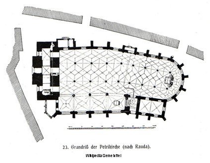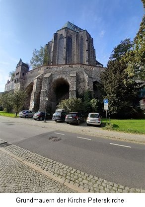 Als nächstes sehen wir eine Art Festungsmauer, später erkennen wir, dass dies die Grundmauern der Kirche St. Peter und Paul (Peterskirche) sind.