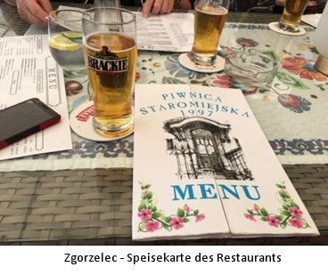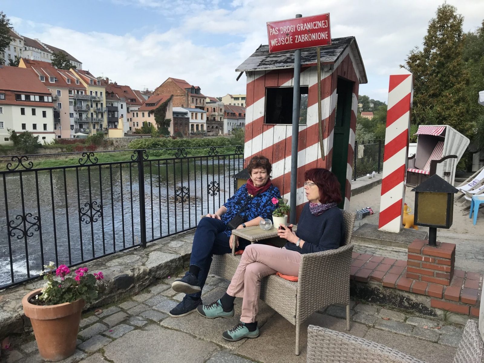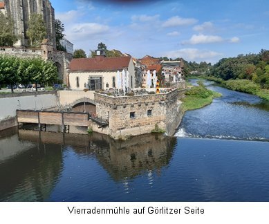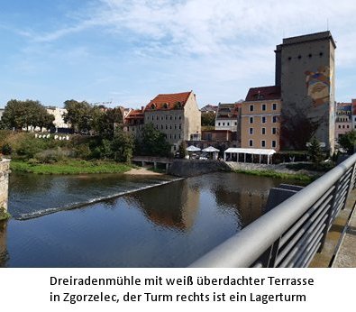 An der Altstadtbrücke über die Neiße nach Zgorzelec gibt es auf Görlitzer Seite die Vierradmühle, auf der polnischen Seite steht die Dreiradmühle, wo wir zu Mittag essen werden.