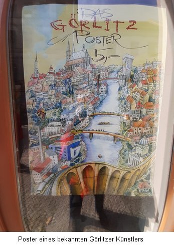 Noch in der Weststadt passieren wir ein Künstler-Atelier, das leider geschlossen ist. Der Künstler ist Herrn Rudolph, unserem Stadtführer für diesen Morgen, persönlich bekannt. Seinen Namen habe ich aber leider vergessen. Ich fotografiere ein von ihm kreiertes Poster im Fenster.