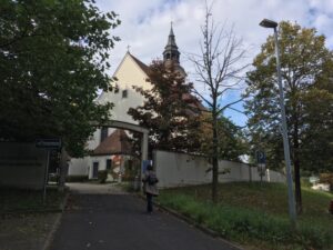 11 Teilnehmer*innen trafen sich um 9 Uhr im Hof des St. Wenzeslaus-Stifts, um mit dem Bus des Tagungshauses und zwei weiteren PKWs nach Bautzen zu fahren. Kurz nach 10 Uhr kamen wir in Bautzen an, das Ortsschild am Eingang war sowohl in Deutsch als auch in Sorbisch.
