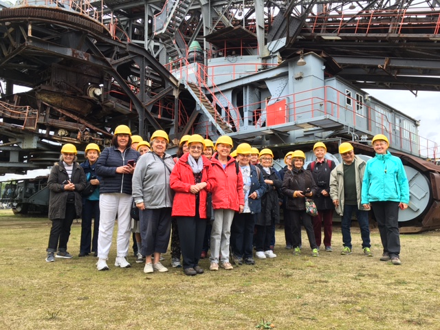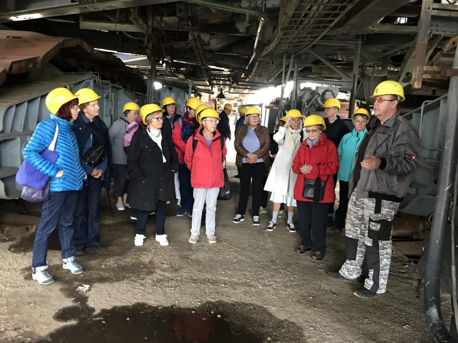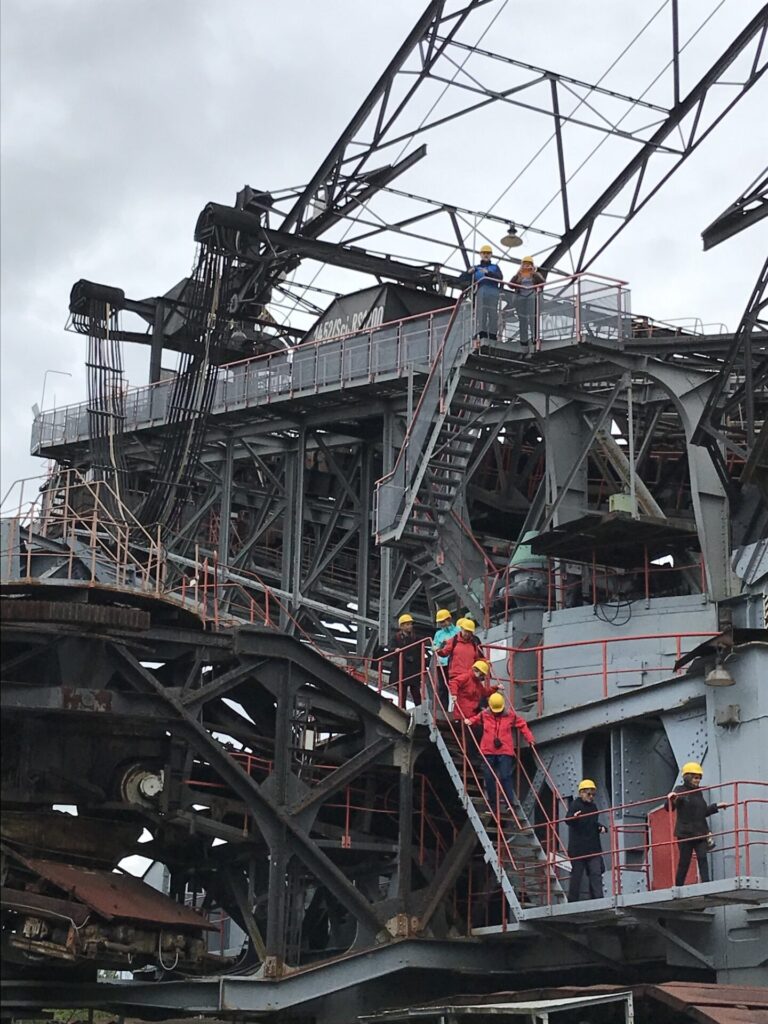 Wo sich heute der Berzdorfer See befindet, schürften bis 1997 riesige Bagger nach Braunkohle. Eins dieser Ungetüme war am 6.10.21 unser Ausflugsziel, das technische Denkmal Schaufelradbagger 1452. Herr Andreas Böhlke, ehemaliger Maschinist auf diesem 33 m hohen Giganten, öffnete uns das Tor zum Gelände und stattete uns mit gelben Schutzhelmen aus. Mutig folgten wir ihm die Stahltreppen hinauf auf die verschiedenen Ebenen seines ehemaligen Arbeitsplatzes. Als der Bagger noch in Betrieb war, war das eine wackelige Angelegenheit, weil der Bagger bei der Arbeit heftig schwankte. Außerdem war man dem Kohlenstaub, den wechselnden Wetterbedingungen und viel Lärm ausgesetzt. Jederzeit musste man auch damit rechnen, dass einem Steine vom Abraum von den Förderbändern um die Ohren flogen. Diese widrigen Umstände wurden mit einem vergleichsweise sehr guten Lohn honoriert. Die geförderte Braunkohle diente der Energieversorgung der DDR und wurde im nahen Kraftwerk Hagenwerder („Völkerfreundschaft“) zur Stromerzeugung (1500MW)verbrannt.