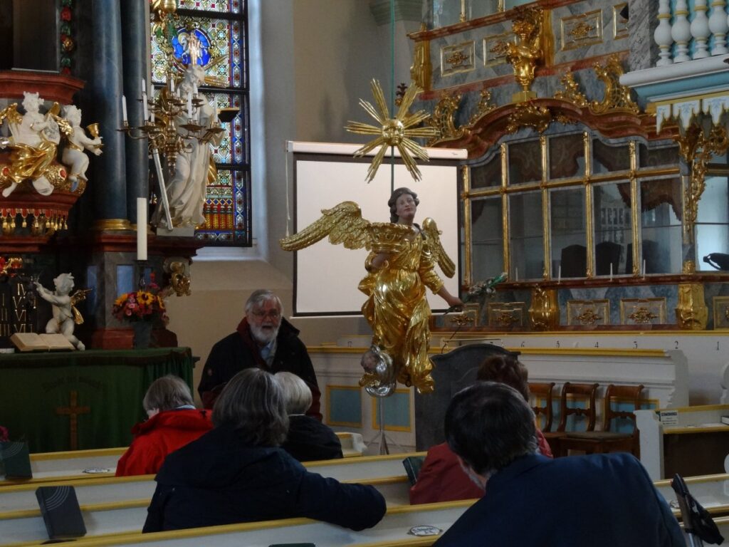 Wegen der Braunkohlegewinnung wurde das ehemalige Dorf Deutsch-Ossig evakuiert und bis auf wenige Häuser zerstört. Einzig die Kirche und ihre wertvolle Barock/Rokoko -Ausstattung hat überlebt, indem man sie an der Peripherie von Görlitz im Stadtteil Königshufen ab 1990 neu errichtete. Auf unserer Stadtrundfahrt konnten wir diese Kirche, die Hoffnungskirche, mit ihrem goldenen Taufengel besichtigen und ihre spannende Geschichte von ihrem ehemaligen Pfarrer, Herrn Scheuerlein, erfahren.